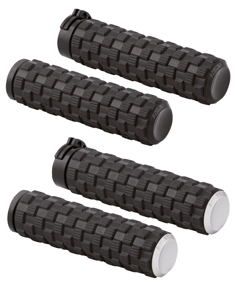 Le manopole Ness AirTrax sono caratterizzate da un design in gomma aggressivo ma confortevole che offre un’eccellente presa riducendo le vibrazioni della mano. I tappi terminali sono realizzati in alluminio ricavato dal pieno con logo Arlen Ness inciso al laser.