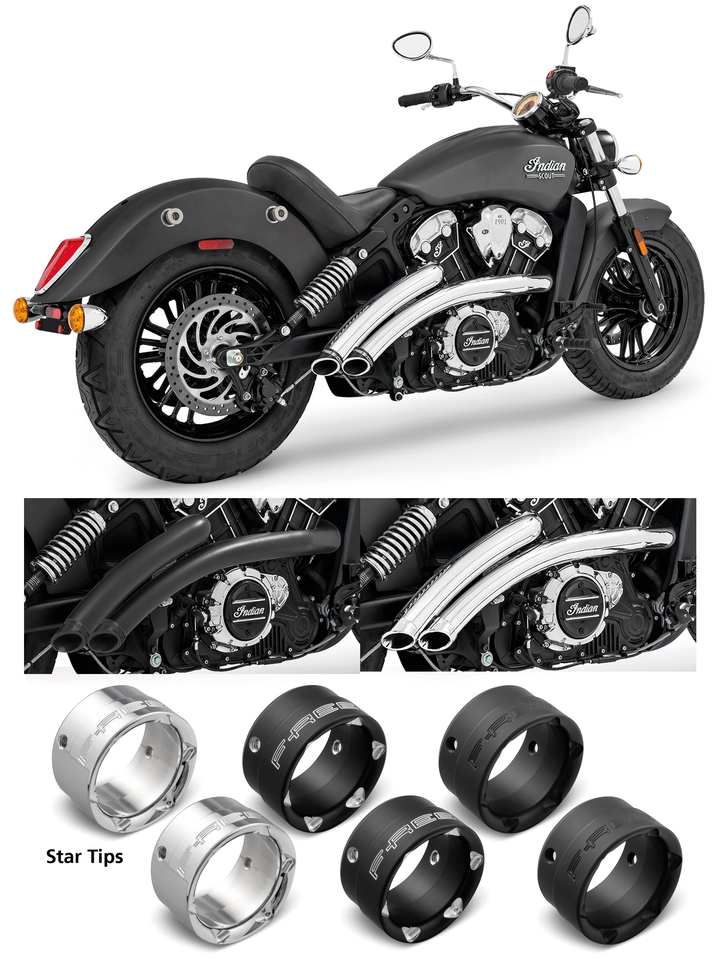 Gli scarichi Freedom Performance Radical Radius sono dotati di uno paracalore in un pezzo unico da 2 1/2″ (64mm) di diametro e da 16 gauge di spessore che i collettori per 220 gradi e hanno un sistema di collettori a tre fasi per offrire una potenza e una coppia ottimali. I silenziatori curvi danno un ringhio profondo e aggressivo. I deflettori sono rimovibili e un kit di deflettore più silenzioso (Quiet baffle) è disponibile come accessorio. Questi scarichi vengono completi e pronti da montare e includono hardware in acciaio inox e staffe.