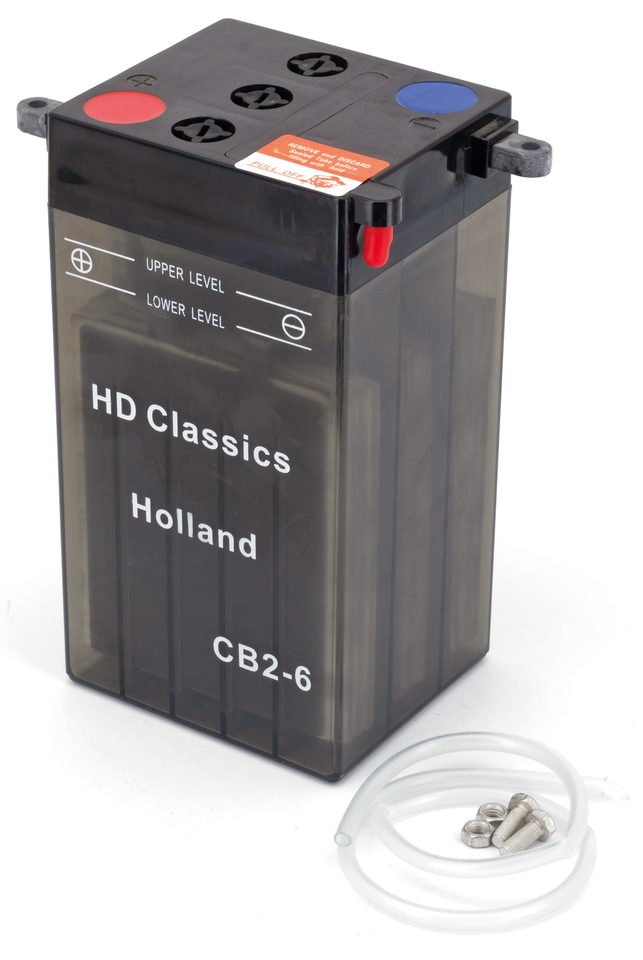 Questa batteria a 6 Volt 22AH monta sulla maggior parte dei Harley-Davidson modelli 1930-1964. Misura 115mm di larghezza, 215mm di altezza e 100mm di profondità. Fornita carica ma senza acido per motivi di sicurezza. L’acido per batterie è disponibile separatamente in bottiglie da 1 litro ma può essere spedito solo via terra. In alternativa potete acquistare l’acido per batterie presso qualsiasi negozio di ricambi auto/moto o fai da te.