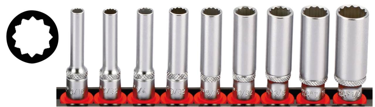 Set di 9 bussole più profonde in pollici con guida da 1/4″ a 12 punti, 3/16″, 7/32″, 1/4″, 9/32″, 5/16″, 11/32″, 3/8″, 7/16″ & 1/2