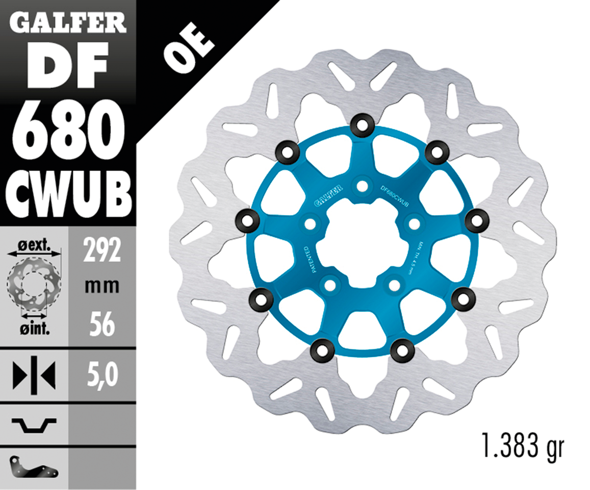 I dischi flottanti Galfer Wave offrono una frenata precisa ed efficiente e un notevole risparmio di peso. Se non diversamente indicato, sono dotati di nottolini in acciaio inox neri che fissano la pista frenante in acciaio inox alla parte centrale in alluminio. Sono utilizzabili con pinze di serie e di ricambio. Sono venduti singolarmente, ordinarne due per applicazioni a doppio disco. Come per ogni disco freno, si raccomanda vivamente di installare nuove pastiglie freno con un nuovo disco freno.