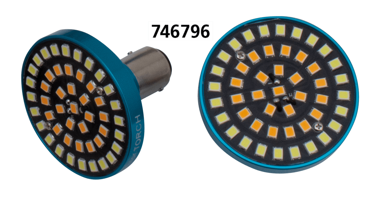 Per indicatori di direzione stile Deuce da 2″ (50,8mm) di diametro con lenti click-on/click-off, Set di due inserti per luci di posizione/di svolta anteriori con circuito Can bus incorporato per eliminare la necessità di un equalizzatore di carico. Hanno LED bianchi halo per le luci di marcia e LED ambra per la direzione. Gli inserti sostituiscono le lampadine a doppio filamento sui modelli USA. I modelli europei richiedono prese per lampadine a doppio filamento e ricablaggio. Utilizzare con lenti chiare o fumé