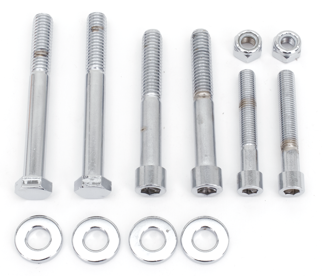 Questi kit di bulloneria e minuteria cromata sono prodotti negli USA da Midwest Acorn & Nut Company o dove indicato da Colony USA. I kit sono disponibili per molti modelli V-Rod, Sportster e Big Twin incluso Twin Cam. Sono disponibili anche kit individuali per molte applicazioni.