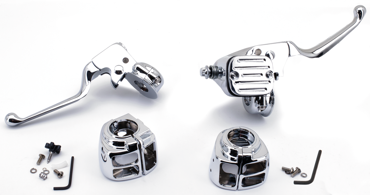 Kit comandi manubrio per Softail 1996-2010, Dyna 1996-2011, Touring 1996-2007 e Sportster 1996-2003. Sono completi di alloggiamenti per interruttori. Accettano i pulsanti OEM o stile OEM. Tutto il necessario per il montaggio è incluso. Questi kit sono disponibili con pompa freno da 9/16″ per modelli con disco singolo e da 11/16″ per modelli con doppio disco freno. Gli alloggiamenti per gli interruttori sul manubrio sono una riproduzione di quelli originali ed accettano sia interruttori OEM, sia interruttori aftermarket. Tutte le parti contenute nei kits sono disponibili separatamente.