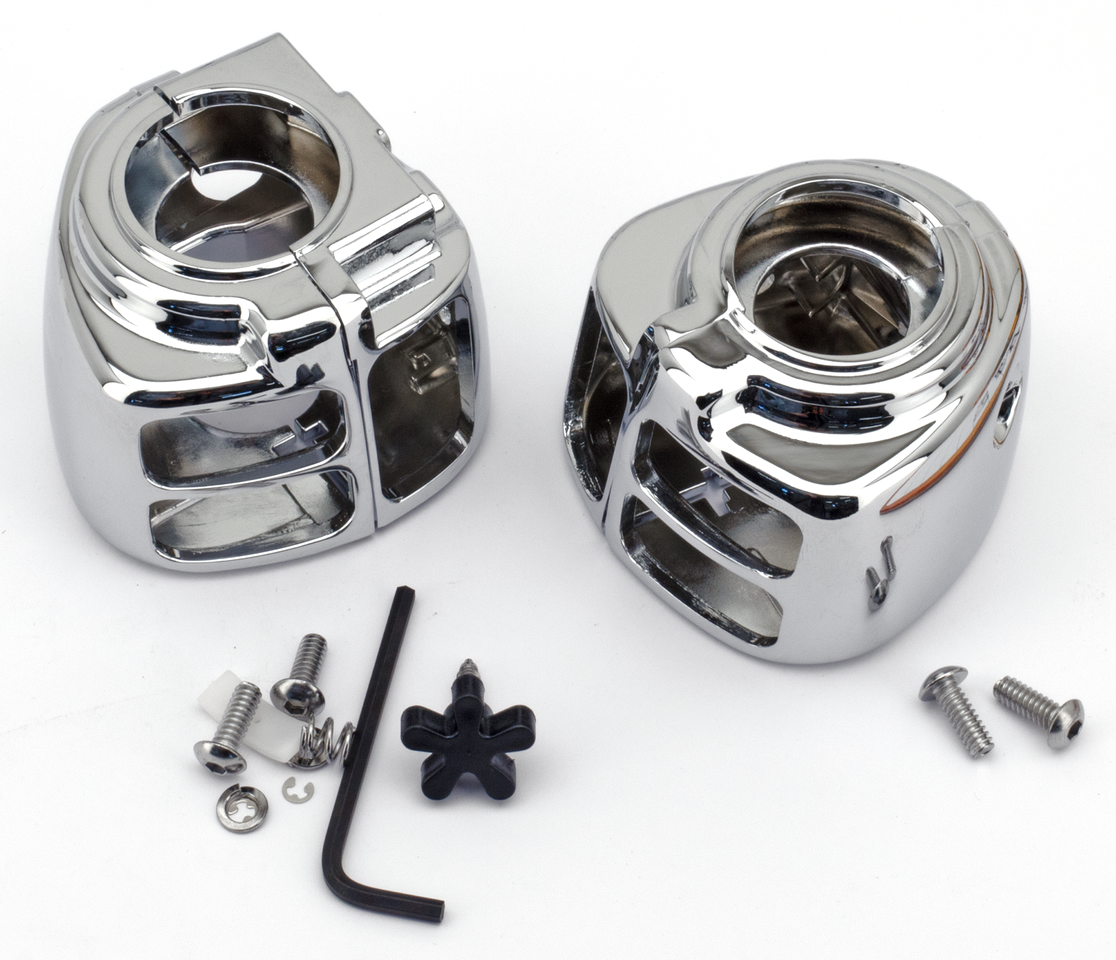 Riproduzione degli alloggiamenti pulsanti originali. Accettano interruttori OEM o aftermarket. senza cablare. Zodiac ha quattro versioni disponibili, vecchio stile, nuovo stile con fori extra sull’alloggiamento sinistro per accogliere il sistema di blocco della frizione introdotto nei modelli 2007, un kit per i modelli con i controlli radio e cruise control, Softail 2011 a oggi e Dyna style 2012 a oggi.