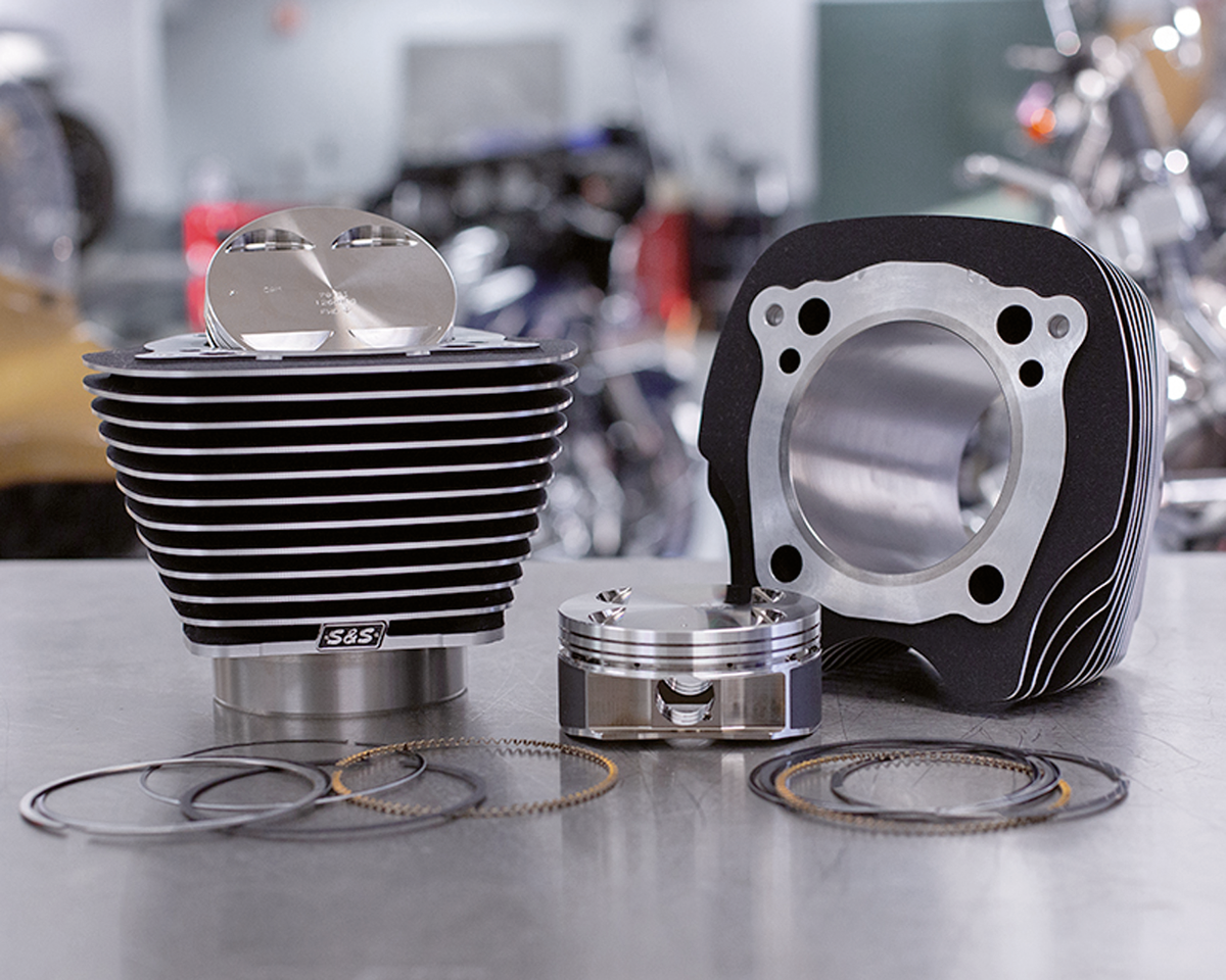 Questi kit Big Bore con alesaggio 4 1/4″ (107.95mm) sono semplici da installare in quanto non richiedono lavorazioni sul basamento. Kit includono pistoni forgiati, fasce, clip spinotto, cilindri nella versione nera o nera con le alette fresate e la guarnizione della base del cilindro. I kit 124CI (2035CC) sono per Milwaukee Eight 107CI con corsa di serie 4.375″. I kit 128CI (2100CC) sono per Milwaukee Eight 114CI e 117CI con corsa di serie 4.500″ stroke.