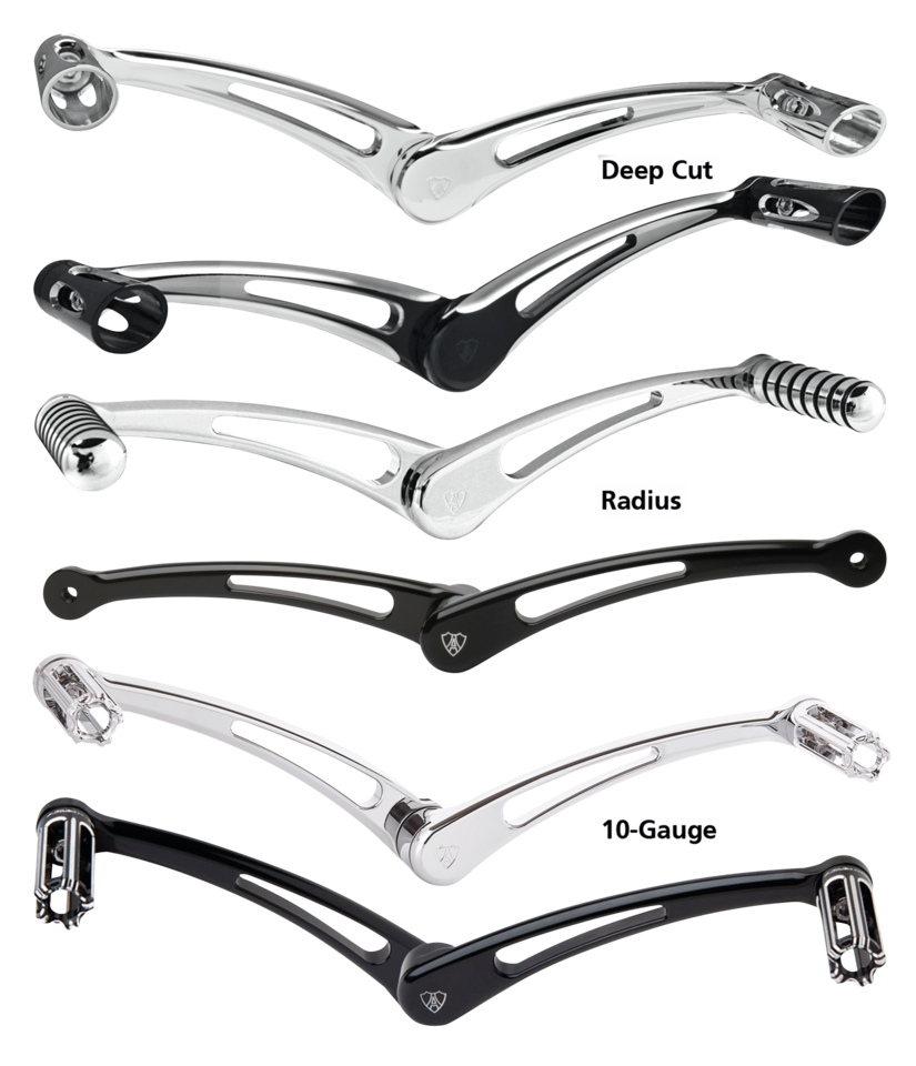 Ultima novità nelle leve cambio da Arlen Ness. L’abbinamento perfetto con i pedali freno Ness, ma possono essere usate anche da sole. In alluminio billet con finitura cromata o nera anodizzata. I modelli Deep Cut e Radius sono disponibili 1″ (2.5 cm) più lunghe per aumentare il comfort ai piloti di alta statura o normale. Il modello Deep Cut è fornito completa di pedalino del cambio, mentre i modelli Radius e Retro non includono il pedale freno che va ordinato separatamente. Tutti i modelli a bilanciere montano su Touring 1988 a oggi e Softail FL 1986 al 2017.