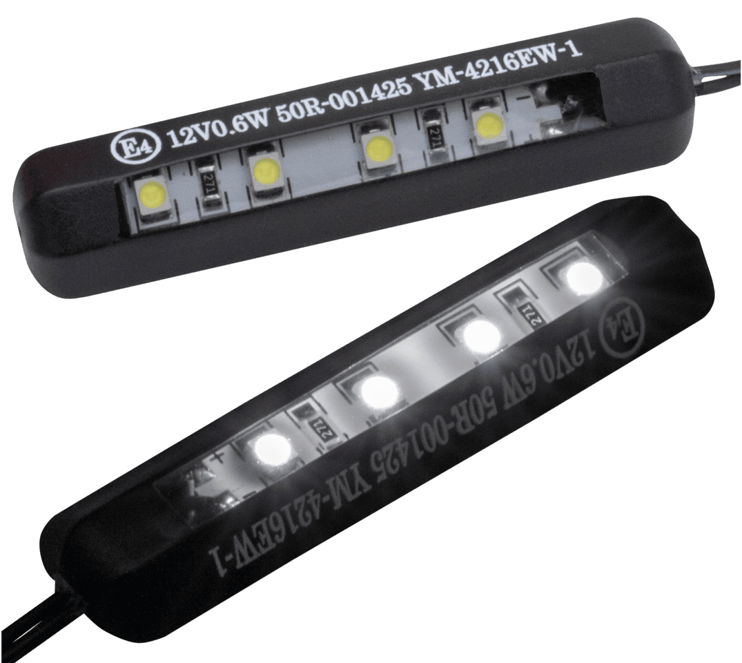 Solo 62mm di lunghezza, 12mm di altezza luce targa trasparente con quattro LED in un alloggiamento di gomma nera autoadesiva. Precablato con cavi da 24″ (60cm).