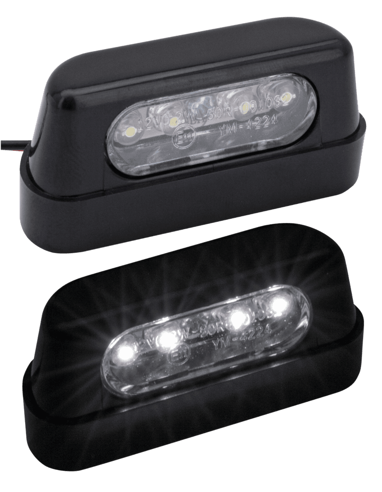 Solo 56 mm di lunghezza, 20 mm di altezza e 25 mm di profondità, luce targa trasparente con quattro LED in un alloggiamento di plastica nera.