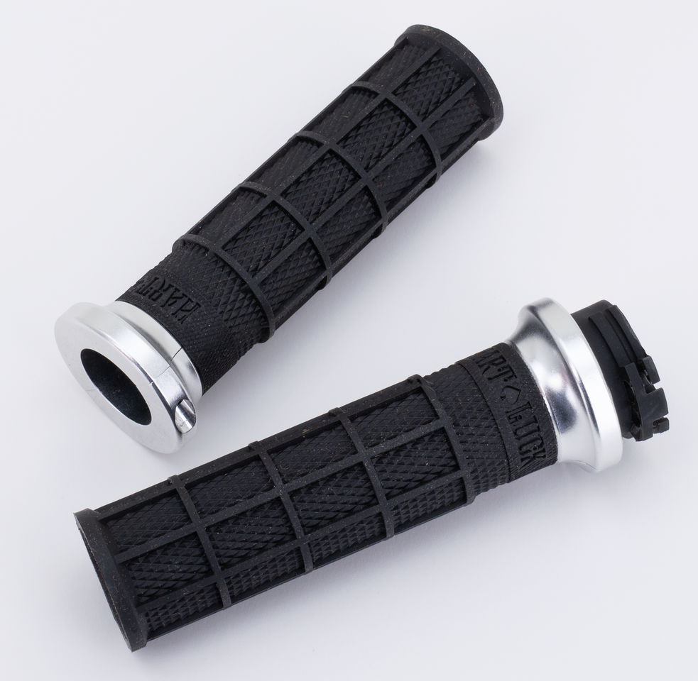 Per tutti modelli con acceleratore a cavo e manubri con 1″ di diametro nell’area comandi, Manopole ODI Hart-Luck Lock-On nere con morsetto argento e logo nero, coppia