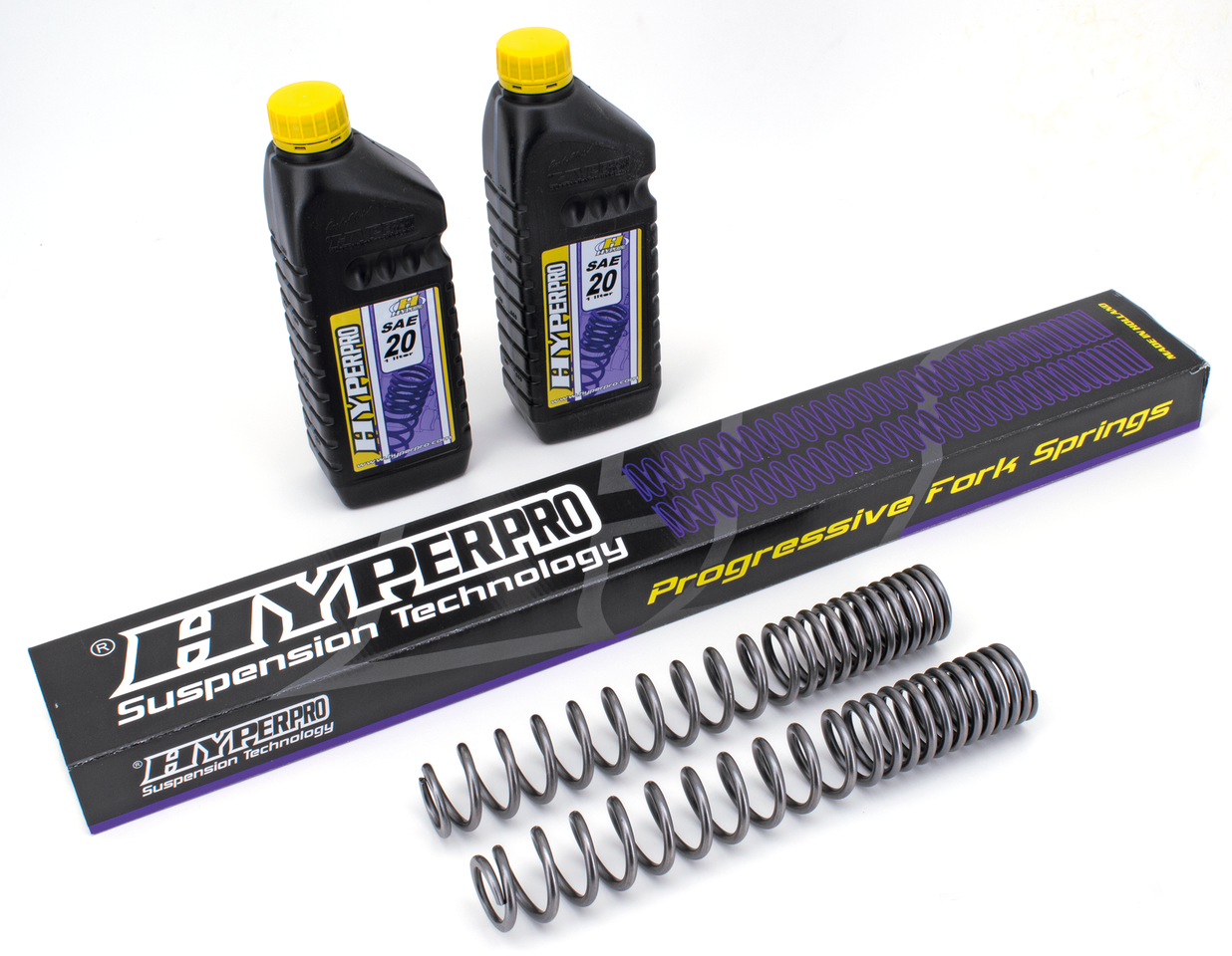 Hyperpro ha dedicato anni di ricerche per lo sviluppo dinamico della tecnologia delle molle da corsa e per applicazioni speciali. Anni di ricerca e sviluppo su forcelle, ammortizzatori, molle e sistemi di sospensione si completano nella filosofia Hyperpro. Spesso una molla lineare è troppo dura o troppo morbida all’inizio e/o alla fine della corsa. Le cosiddette molle progressive a due stadi sono un miglioramento, ma restano un compromesso tra sicurezza e comfort. Il passaggio da soffice a duro è spesso percepito con incertezza e può portare ad ondeggiamenti in velocità. Hyperpro ha formulato una soluzione senza compromessi: il disegno di curva “Link System” per molle. Con questo tipo di costruzione una molla può essere disegnata per soddisfare tutte le richieste della moderna tecnologia. Hyperpro ti dà una parte iniziale della corsa di grande sensibilità, con una durezza costantemente crescente per sicurezza ed antiaffondamento a fine corsa. Grazie all’uso di materiali di alta qualità e lavorazioni di precisione si hanno le migliori molle in commercio. Le molle sono costruite su standard DIN-2095 classe 1, accuramente lucidate per ridurre gli attriti e garantite contro la rottura. Kit completi di molle, un litro di olio per sospensioni Hyperpro, un tubetto di lubridficante Hyperpro e un manuale professionale per la messa a punto delle sospensioni.