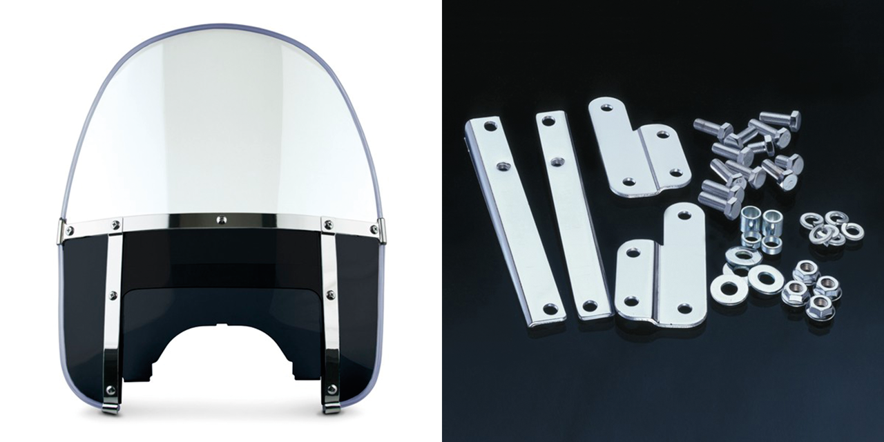 Per forcelle da 41mm su FL Hydra Glide e Duo Glide 1949-1959, Kit parabrezza completo con parte superiore tonda stile 1960-1984, trasparente con parte inferiore nera