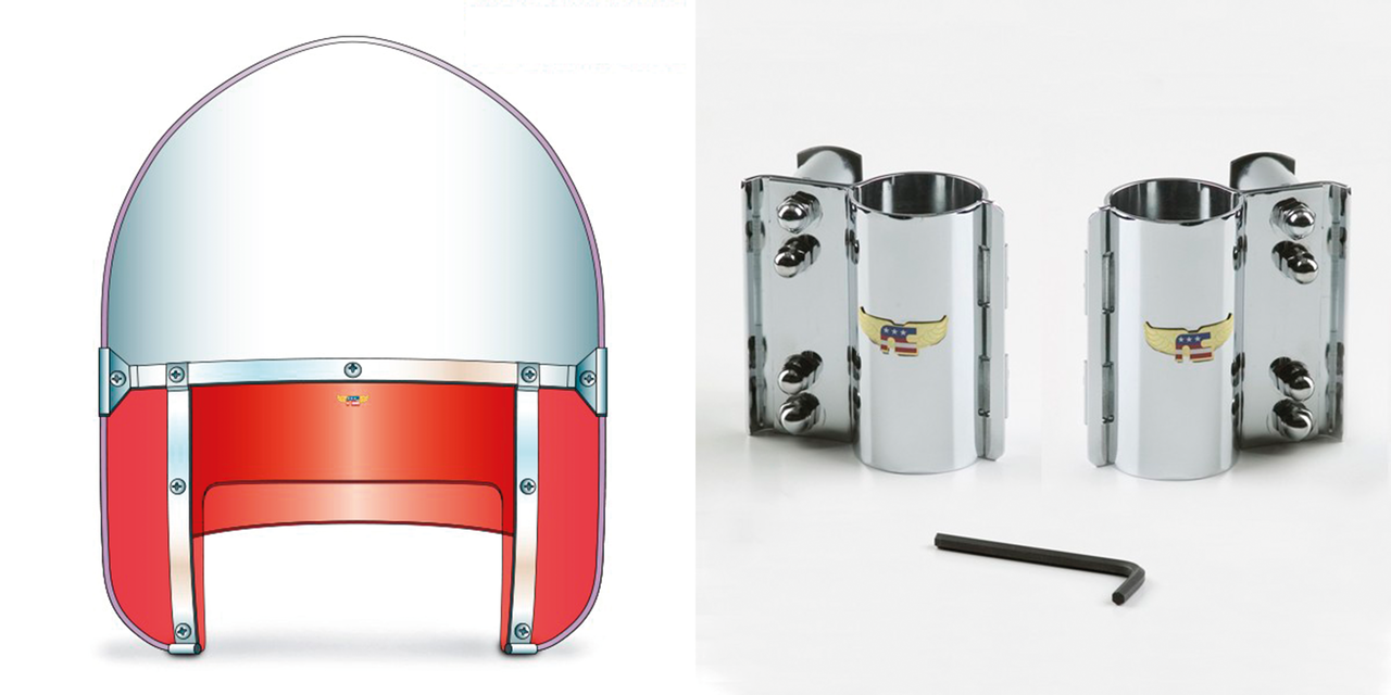 Per forcelle da 41mm su FXWG 1980-1985, FXDG Disc 1983, FXDWG 1993-2005, FXST & FXSTC Softail 1984-2012, FXSTB Night Train 1999-2007 e FXSTD Deuce 2000-2007, Kit parabrezza completo con parte superiore a punta stile 1949-1959, trasparente con parte inferiore rossa