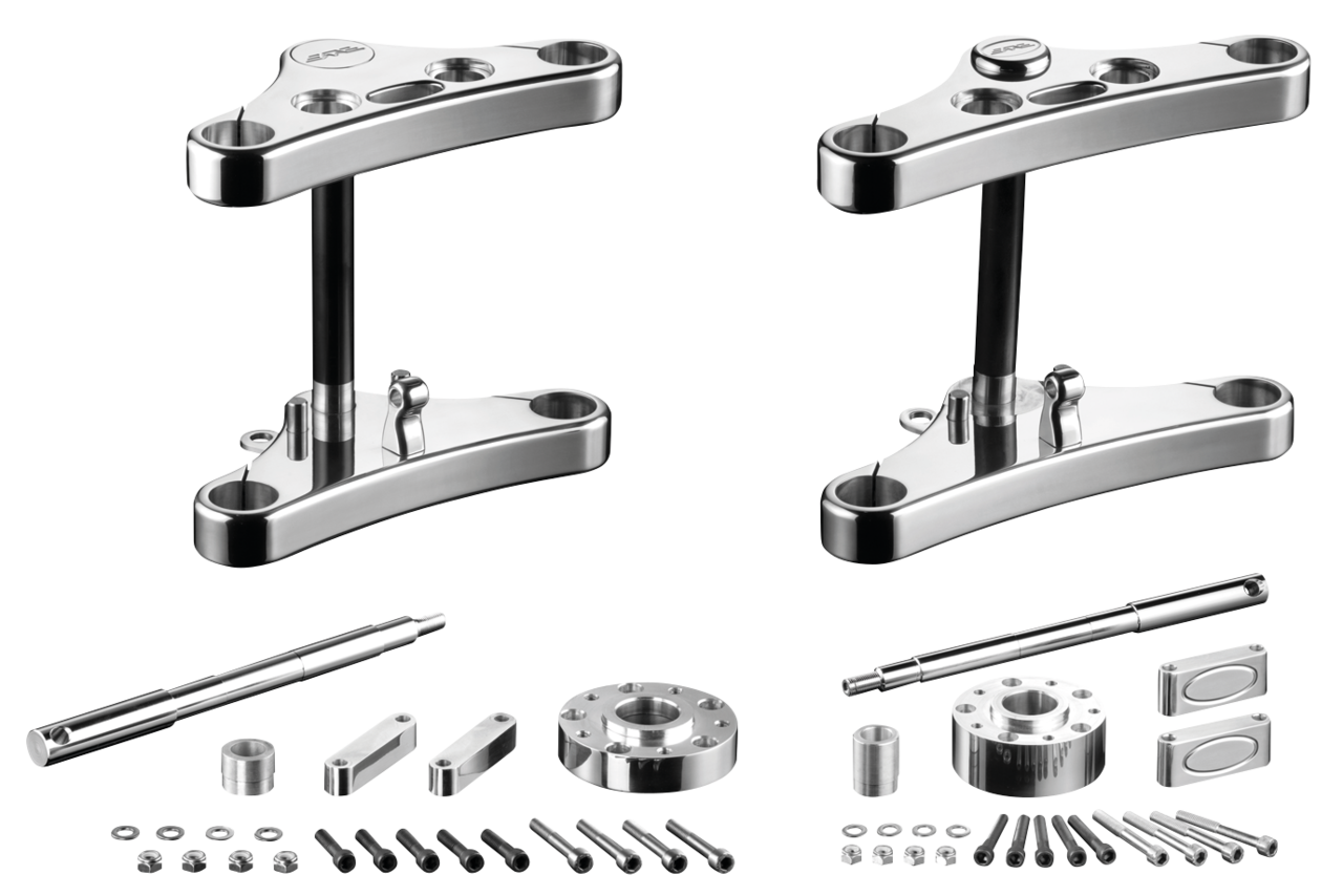 Le piastre Leda di Rebuffini sono spesse 34mm di solido alluminio billet con linee filanti. Sono disponibili per tutti XL, FXR e Dyna 1988 a oggi, con un inclinazione di 0 o 4 gradi e nella versione Mid Glide con interasse di 222mm o Wide Glide con interasse di 252mm. Tutte le versioni hanno una una feritoia nella piastra superiore per il passaggio dei cavi di acceleratore e frizione. Le piastre per Sportster e Dyna lavorano con il bloccasterzo di serie. I gommini di montaggio del manubrio devono essere accorciati di 6mm, oppure potete usare quelli opzionali in gomma o un sistema di montaggio rigido. I kit includono un perno ruota cromato, un distanziale disco freno lucidato, un blocchetto di montaggio basso per il fanale, distanziali parafango e tutto il necessario per il montaggio. Per le applicazioni doppio disco dovete acquistare separatamente un distanziale disco freno. Una staffa opzionale per il montaggio del fanale di serie sulla piastra superiore è disponibile separatamente.