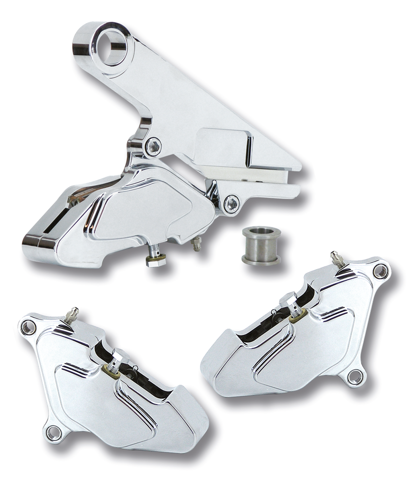 Pinze freno che si montano direttamente sulle forcelle anteriori da 39 e 41 mm dei modelli 1984-1999. Lavorate a controllo numerico dal pieno in alluminio billet con tolleranze molto strette, lucidate a specchio e infine cromate in modo impeccabile per un aspetto davvero personalizzato. Le pinze sono complete di bulloni di montaggio cromati, bullone banjo cromato, pastiglie freno e nipplo di spurgo. La pinza anteriore destra si adatta anche all’anteriore sinistra sui modelli FLSTS, FLSTSC e FLSTSB Springer Softail 1997-2011. La staffa della pinza posteriore accetta anche la maggior parte delle pinze freno anteriori di serie 1984-1999 imbullonate direttamente sul lato sinistro per scopi personalizzati.