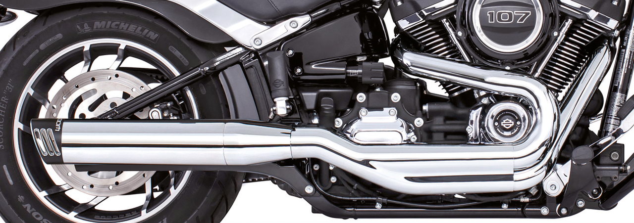 Softail FLSB Sport Glide dal 2018 a oggiSilenziatore singolo, diametro 4″Versione race, Cromato con tappi finali scolpiti neri