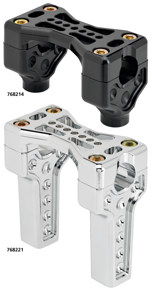 Questi riser sono realizzati per manubri da 1″. Essendo dotati di morsetti superiori monoblocco in stile Bridge, sono ottimi anche per i manubri Fat Bar che si riducono a 1″ nell’area di serraggio. I riser si adattano alle piastrei superiori standard Harley-Davidson con interasse dei fori di 3 1/2″ (8,9cm). I riser sono filettati da 1/2-13″ UNC e sono lavorati a controllo numerico su barra 6061-T6 per la massima resistenza.