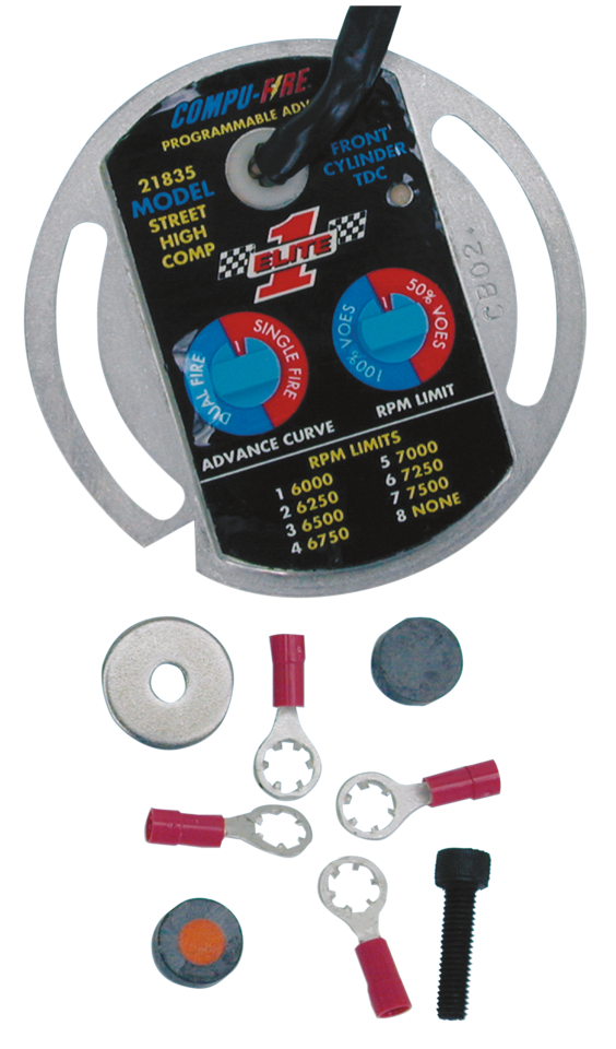 Compu-Fire dichiara che il suo modulo di accensione con curve di anticipo selezionabili è uno tra i più semplici nell’uso reperibili sul mercato. Contiene una serie di curve di anticipo che coprono l’uso per motori di serie fino a quelli più performanti. Gli interruttori rotativi permettono la scelta di curve e limite di giri. L’installazione è semplificata dalla presenza di una luce a LED che permette di effettuare l’anticipo statico. Modulo è testato per varie temperature e un basso voltaggio per permettere l’accensione anche in condizioni particolari, può funzionare sia in modalità Single che Dual Fire con bobine che hanno una resistenza primaria tra 2,5 e 3Ohm. Il VOES è regolabile. Usare l’adattatore ZPN238038 per l’so in Single Fire con un tachimetro elettronico. Disponibile in una versione per motori di serie o leggermente modificati e una versione per motori molto performanti con un alto rapporto di compressione. La versione per Alta Compressione non è adatta per l’uso con accensione a pedale. Per Big Twin 1970-1999 (esclusi Twin Cam) e Sportster 1971-2003.
