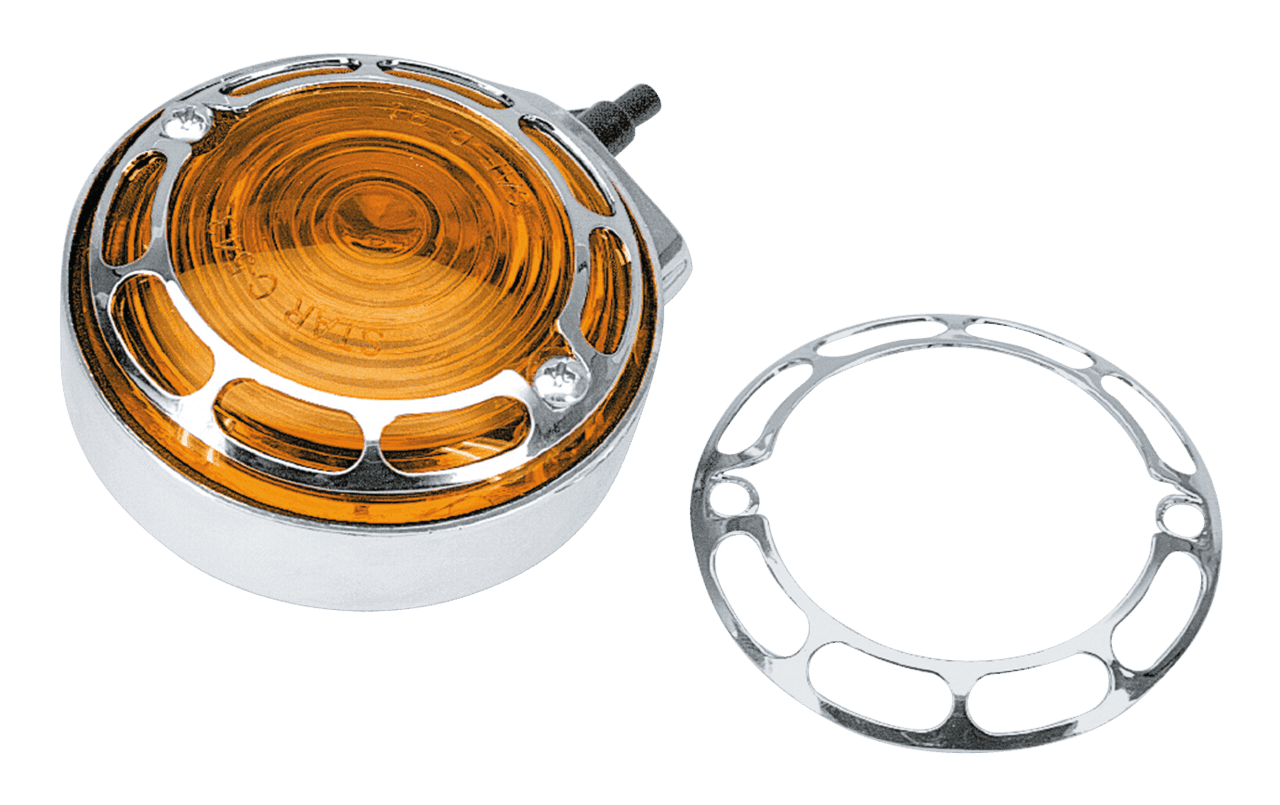 Anelli per frecce in acciaio stampato cromato, bulloneria cromata inclusa. Per frecce originali o aftermarket. Per lenti piatte su indicatori di direzione di molti modelli “Dresser” dal 1963 al 1985. Vendute in coppia.