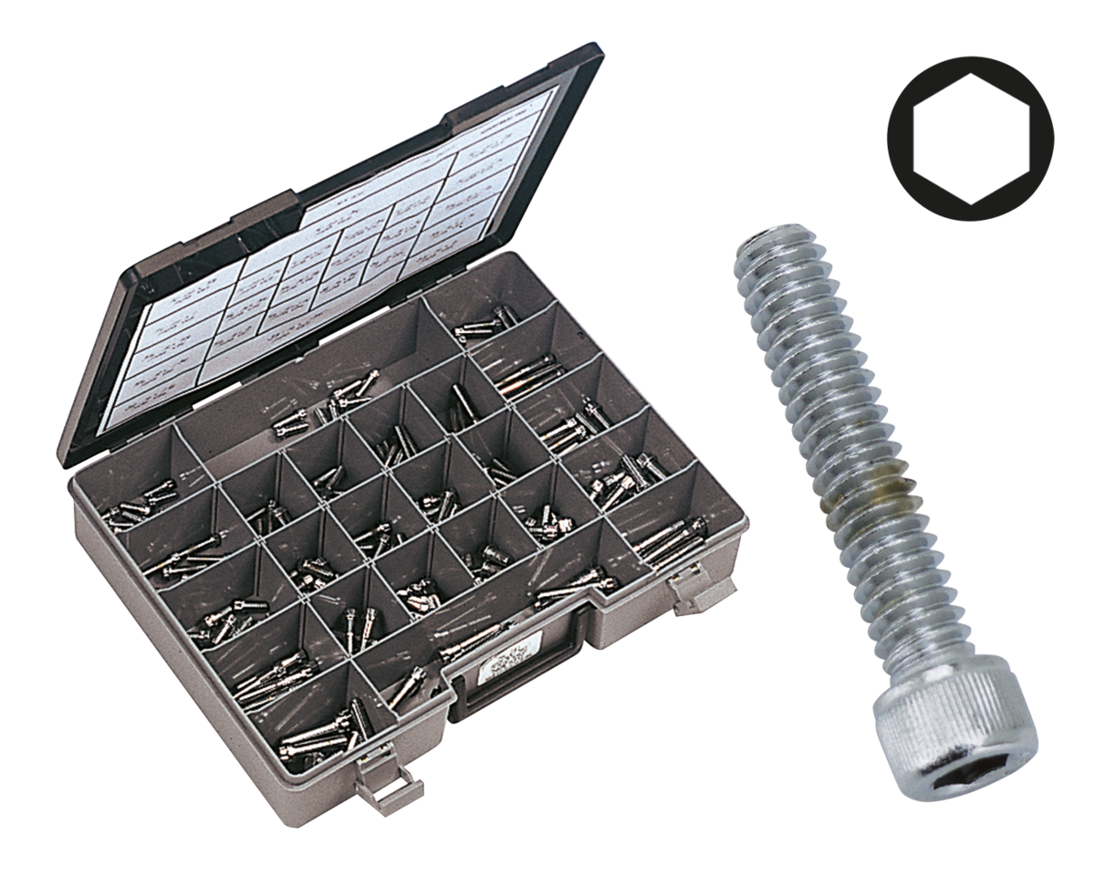 Assortimento di viti a brugola in acciaio di zingrate grado 8. Contiene 215 viti con passo fine (UNF) o grosso (UNC), come sotto elencato. Ogni singola misura può essere ordinata in conf. da 10 pezzi.
