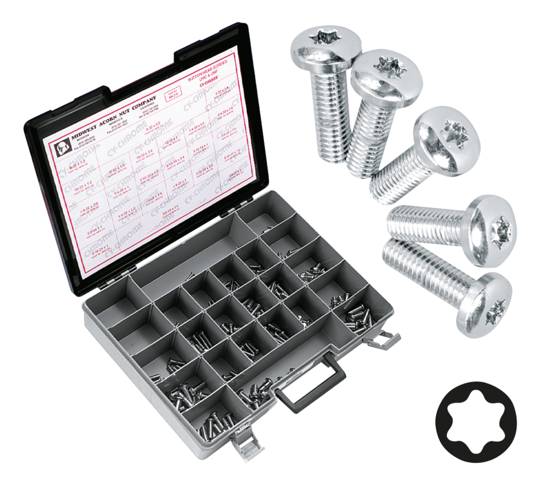Assortimento di viti torx cromate in acciaio di grado 8. Le viti torx sono il migliore ricambio per le viti a brugola, in quanto forniscono una maggiore superficie di contatto tra la testa e la chiave eliminando il rischio di danneggiare la testa stessa. La cassetta contiene 200 pezzi nelle misure sotto elencate con filettatura a passo grosso (UNC) e fine (UNF). Ogni misura può essere ordinata individualmente in confezione da 10 pezzi.
