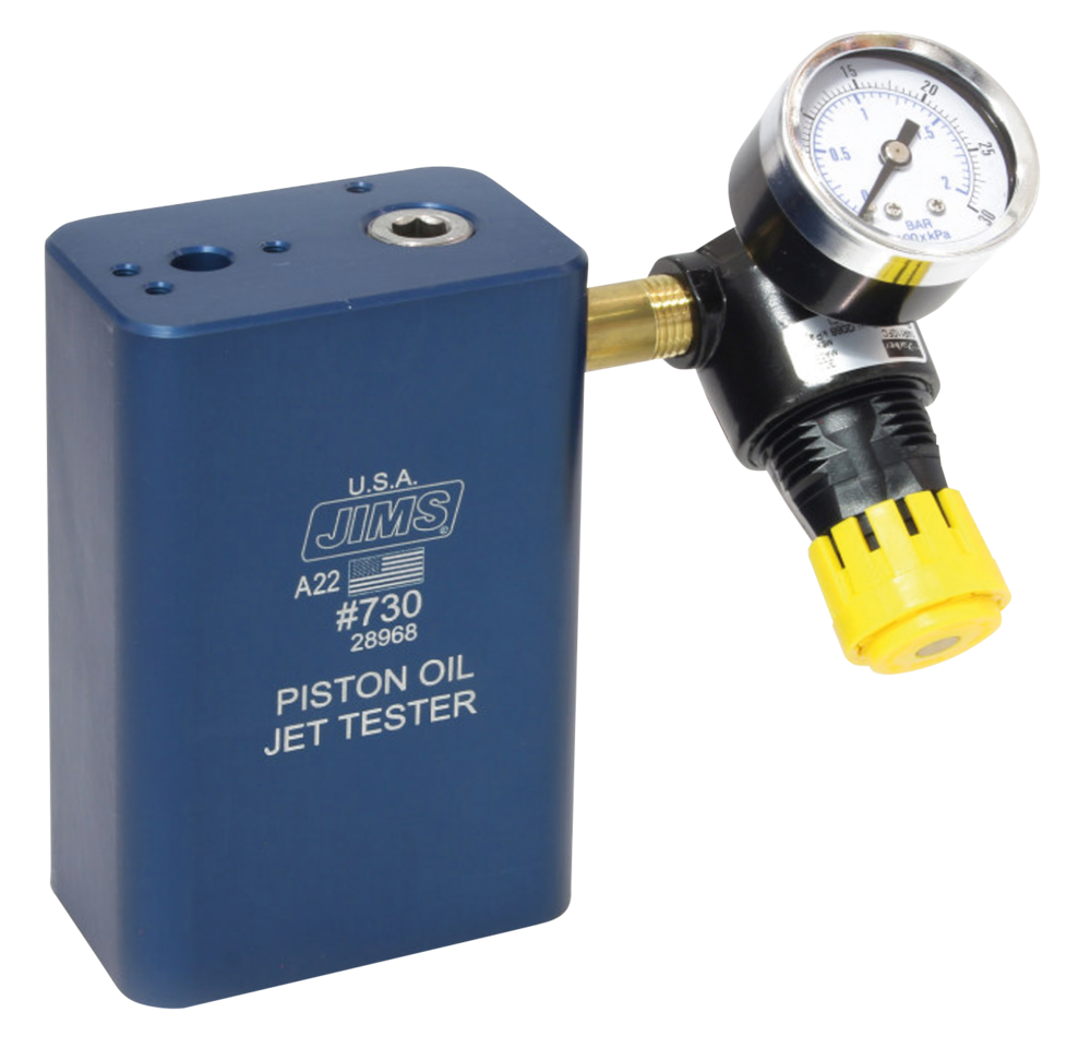 Collocati in una posizione remota del carter motore è difficile verificare se questi getti stanno funzionando in maniera corretta. Niente come questo banco di prova di Jims consente ai costruttori di motori di testarli prima di installarli. L’unità funziona sia con aria compressa che aria su olio. Quando si opera solo con aria, è possibile verificarne la corretta circolazione attraverso il getto del pistone. In modalità aria su olio, non solo è possibile controllare il corretto funzionamento, ma anche vedere fisicamente il pattern di spruzzatura dell’olio emanato dal getto. Regolando il regolatore dell’aria sull’unità, i meccanici sono in grado di determinare a quale pressione il getto del pistone si accende e si spegne. Un ulteriore vantaggio del banco di prova dei getti dei pistoni è la possibilità di eliminare il lubrificante di assemblaggio dal passaggio stretto dell’olio del getto