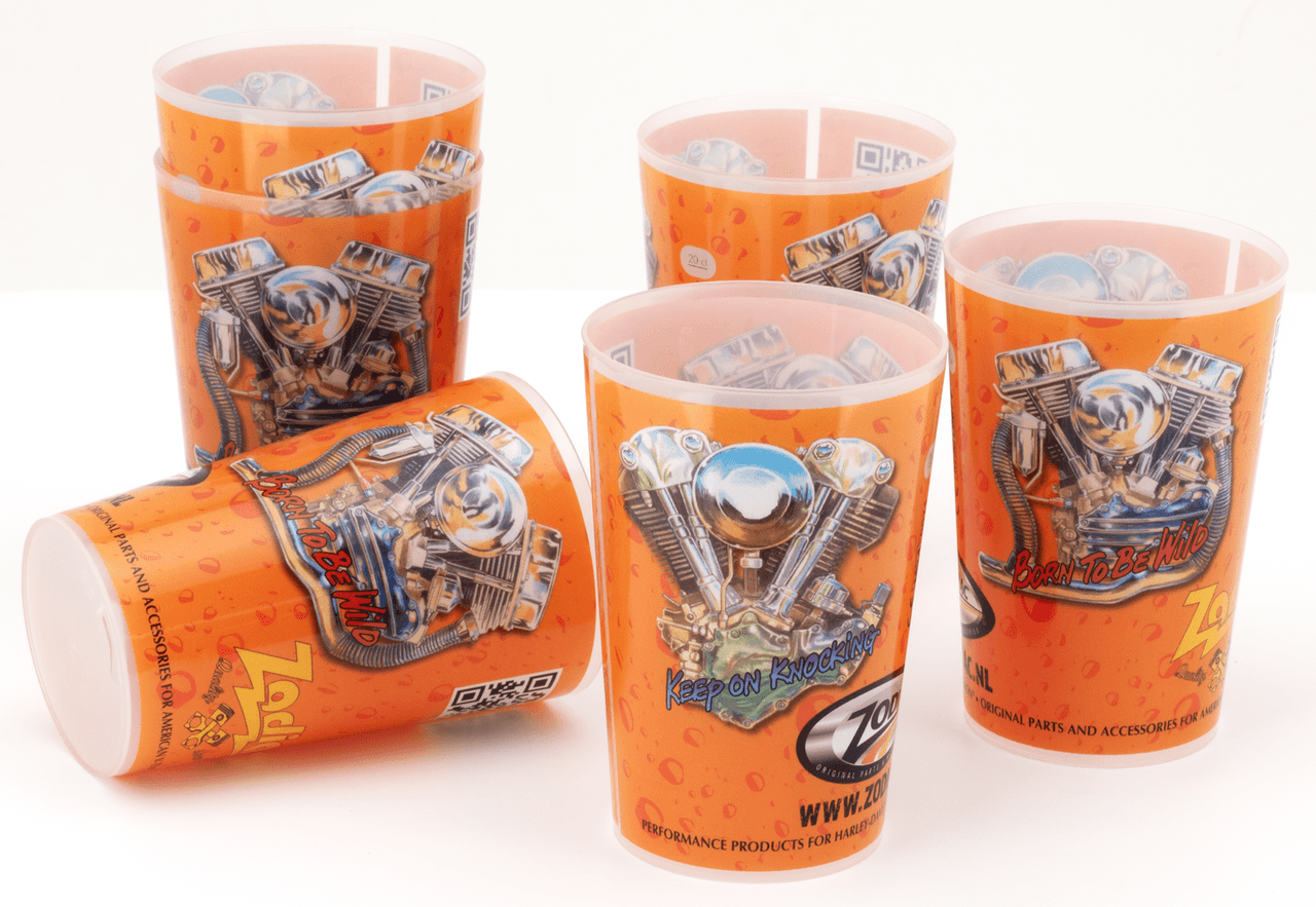 Bicchiere riutilizzabile per birra, soda, vino, caffè o tè. Realizzato in polipropilene omopolimero. Lavabile in lavastoviglie fino a 100 gradi Celsius e usabile in microonde fino a 10′ e 1.000 Watt. La tazza può contenere fino a 28cl. Ideale per giornate a porte aperte, club house, feste o il vosro garage.