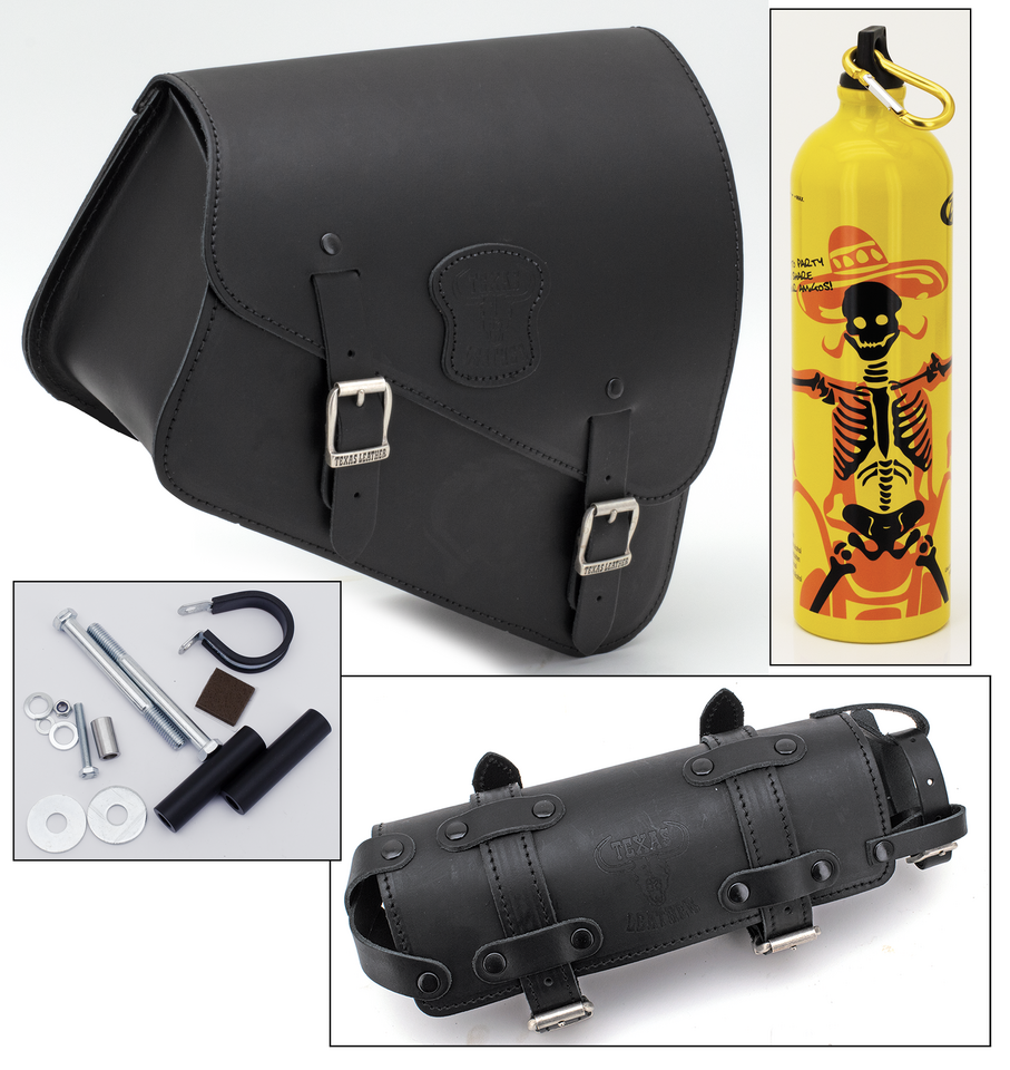 Per tutti Sportster XL 2014-2022, Pelle nera con fibbie opache, minuteria di montaggio, bottiglia per la bevande Chuchaqui e portabottiglia