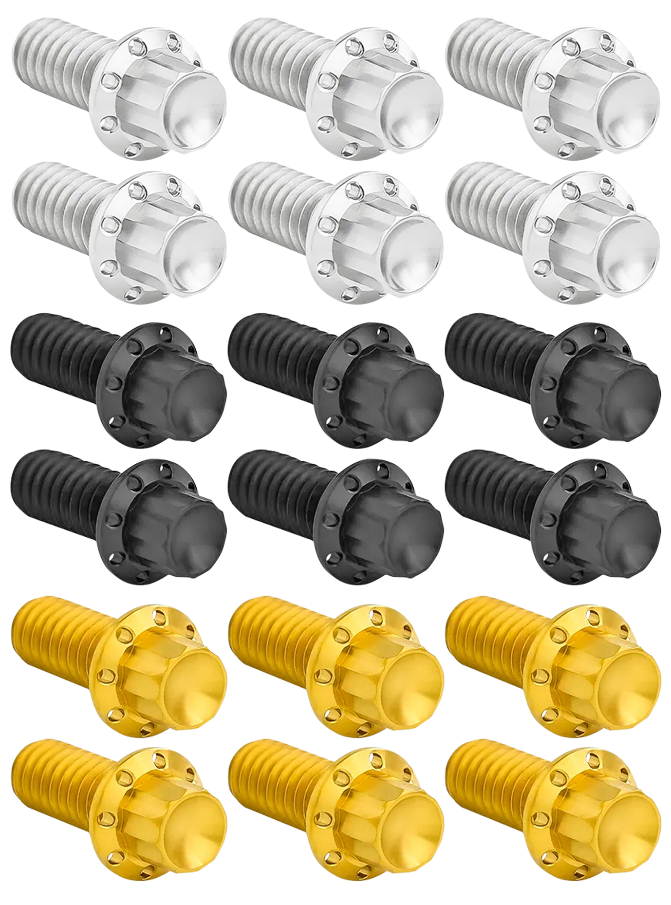 Questi kit di bulloni a 12 punte sono realizzati in titanio massiccio con lavorazione CNC. Ogni bullone in titanio a 12 punte è meticolosamente lavorato con CNC e presenta una testa forata e un design con foro di alleggerimento sulla flangia del bullone. Peso ridotto rispetto ai componenti originali e all’acciaio inossidabile. Il kit include tutti i bulloni necessari per il coperchio frizione. Disponibile in versione lucida, nera e dorata.