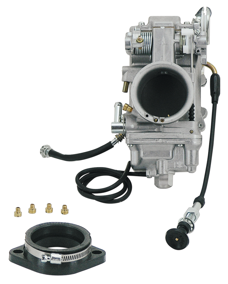 Mikuni ha sviluppato il carburatore HSR48, basandosi sul disegno dei precedenti HSR42 ed HSR45 per dare un grosso Venturi da 48mm a tutti i motori performanti. Non considerate questo carburatore come un ricambio ad un motore di serie ma come un carburatore veramente performante e “Racing”, il che vuol dire che è per uso custom e non di ricambio all’originale. Mikuni raccomanda caldamente l’uso di una pompa benzina elettrica con pressione non eccedente 4 PSI su motori che producono più di 120 cavalli. Dovete installare la valvola ad ago ZPN 720449 quando usate queste pompe benzina elettriche. Il carburatore HSR48 può essere montato sul collettore S&S Super G se usate la flangia di adattamento di gomma Mikuni. Questa combinazione protende il carburatore verso l’esterno ed è consigliato di controllare gli spazi con il serbatoio benzina. Il carburatore HSR48 può essere usato con i cavi acceleratore di serie come sui Big Twin 1990-2017. Il carburatore è fornito con la flangia di adattamento. Il collettore deve essere ordinato separatamente secondo l’applicazione. Questi collettori non lavorano con le guarniozo OEM, vanno usati con le guarnizioni S&S disponibili separatamente.
