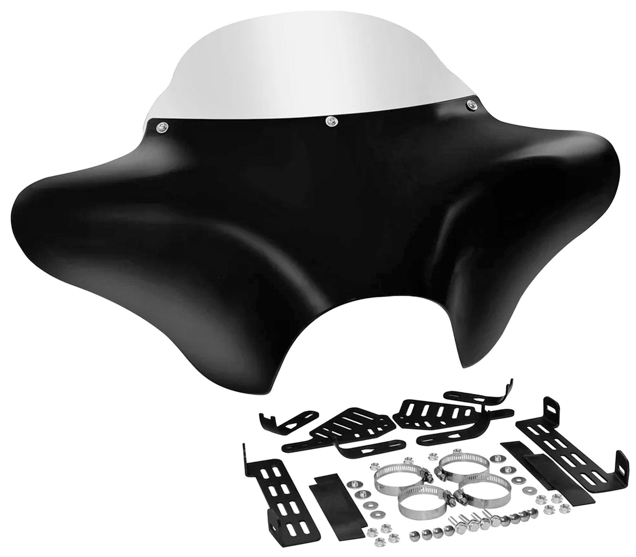 Questa carenatura universale stile Batwing è adattabile a molti modelli con le forcelle da 41mm o 49mm con gli steli non coperti tra le piastre forcella. Fornita completa di staffe e minuteria, può essere ordinata con parabrezza trasparente o fumè. Costruita in ABS e verniciata nero lucido.