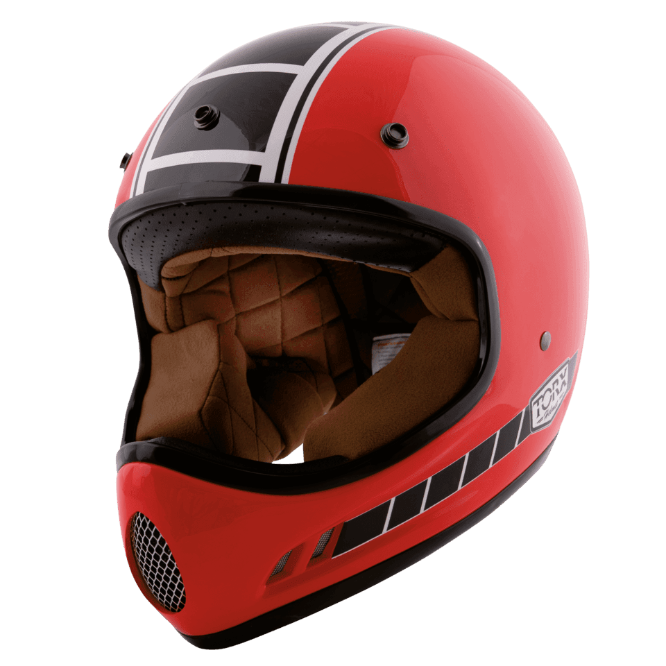 Caschii ispirati al motocross approvati E. Le caratteristiche includono un classico striscia in stile racing in bianco e nero bloccato, una visiera parasole rimovibile e un paradenti ventilato.