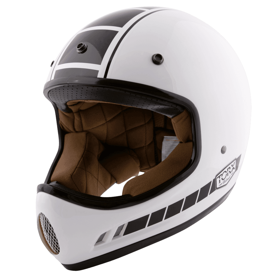 Caschii ispirati al motocross approvati E. Le caratteristiche includono un classico striscia in stile racing in bianco e nero bloccato, una visiera parasole rimovibile e un paradenti ventilato.