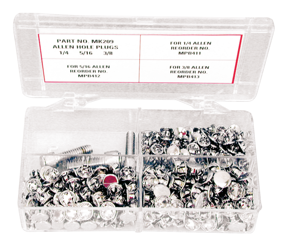 Cassetta con tappi per l’esagono cavo delle viti a brugola 1/4″ o M6 (chiave 3/16″ o 6mm), 5/16″ o M8 (chiave a brugola 7/32″ o 6mm) e 3/8″ o M10 (chiave a brugola da 5/16″ o 8mm). Contiene 100 pezzi per ogni misura (300 in tutto). Disponibili anche conf. 100 per ogni misura.