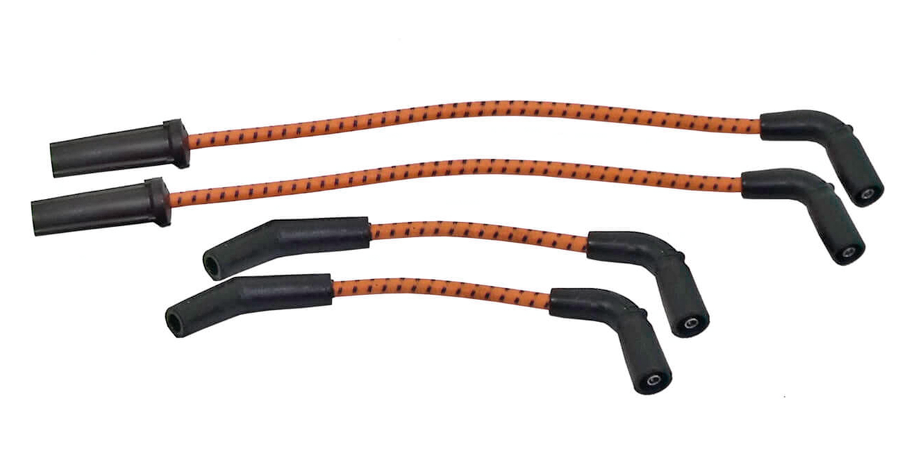 Cavi da 7mm in silicone nero con rivestimento esterno sintetico, resistente a calore olio e abrasioni. Una combinazione di un nucleo a spirale in kevlar con una resistenza di 350Ohm per piede, ofre una potente scintilla, aumentando la potenza, la regolarità e l’efficenza dei consumi. Cappucci in silicone e nero proteggono dall’alta temperatura dei gas di scarico. Una doppia molla blocca i terminali per assicurare una connessione a prova di vibrazioni. Questi cavi sono adatti a tutti Harley-Davidson e Buell con puntine o accensione elettronica. Include due cavi da 24″ con pipette candela 90° o dritte.