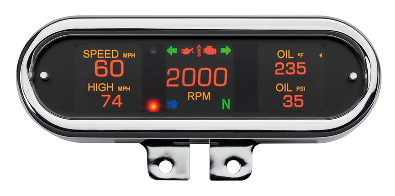 Per modelli Harley-Davidson 1996-2003 con un sensore elettronico di velocità montato sulla trasmissione standard e ad altre moto in cui viene utilizzato un sensore elettronico di velocità accessorio, Centro informazione digitale stile Oval, cromato