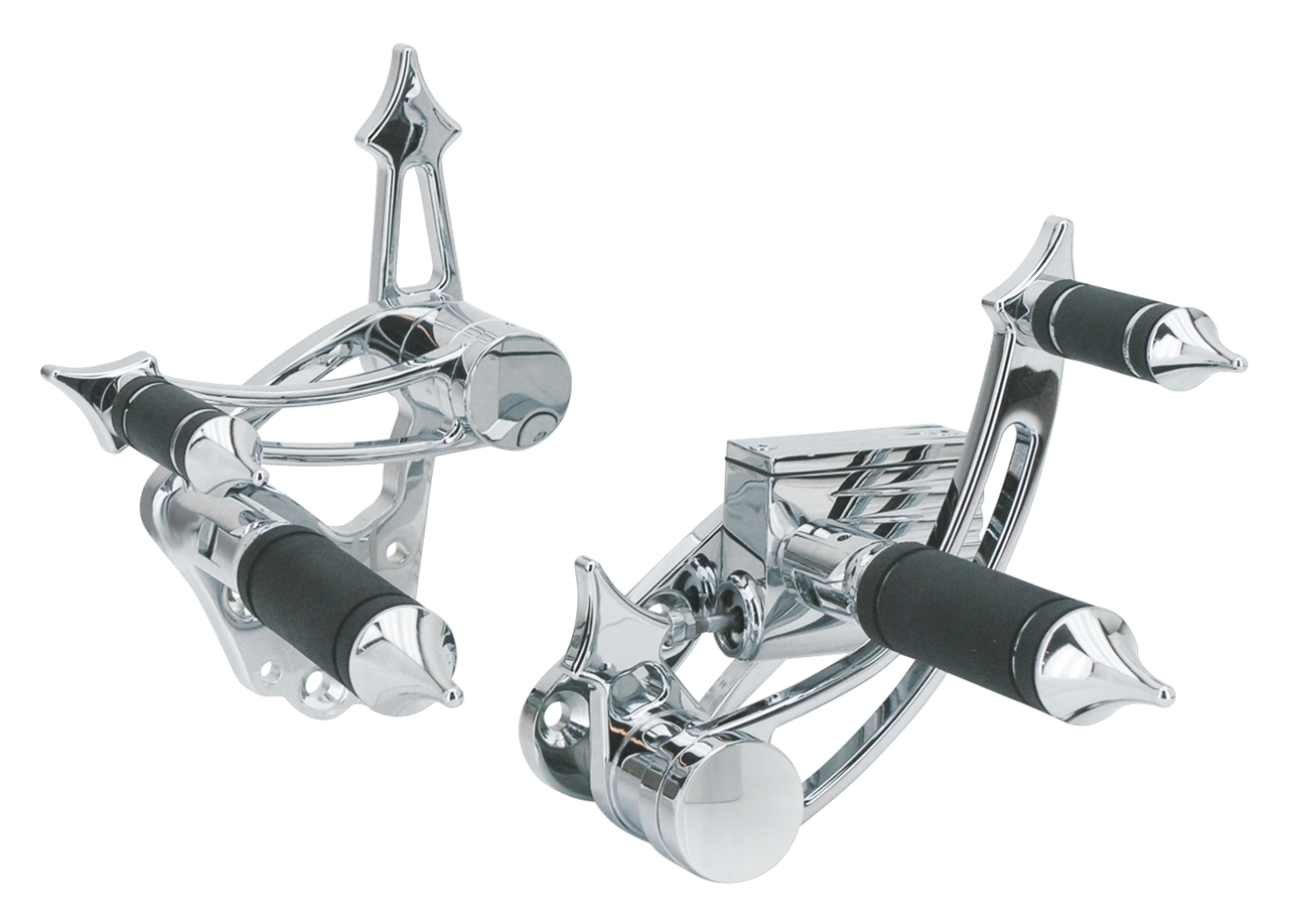 I comandi avanzati Gladiator sono ricavati da alluminio billet di tipo aeronautico e finemente cromati. I kit includono una pompa freno da 5/8″ tipo Kelsey-Hayes e le pedane con bande in gomma. I pedali del freno e del cambio lavorano su bronzine facilitando i movimenti e diminuendo l’usura. Nonostante l’aspetto l’esclusivo il kit è molto economico. Montano su tutti Softail Evolution a 4 e 5 marce e su FX e FL 1958-1986.