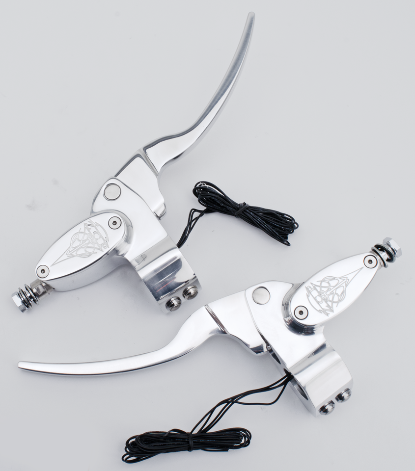Non solo un altro prodotto custom, ma un set di comandi manubrio di alta qualità che può competere sul mercato. Ce ne sono altri in circolazione, ma nessuno della stessa qualità ad un prezzo abbordabile. In alluminio billet lavorati a CNC con un disegno tribale inciso sul coperchio della pompa freno, questi comandi sono il meglio per qualsiasi moto custom. I kit sono forniti completi con pompa freno, leva frizione o pompa frizione idraulica e pulsantini. Le pompe freno hanno un alesaggio di 5/8″, una misura che va bene per molte applicazioni con disco singolo o doppio. La pompa frizione è da 9/16″ una misura che lavora bene con molti attuatori frizione idraulica. I kit sono disponibili lucidati, neri o cromati.