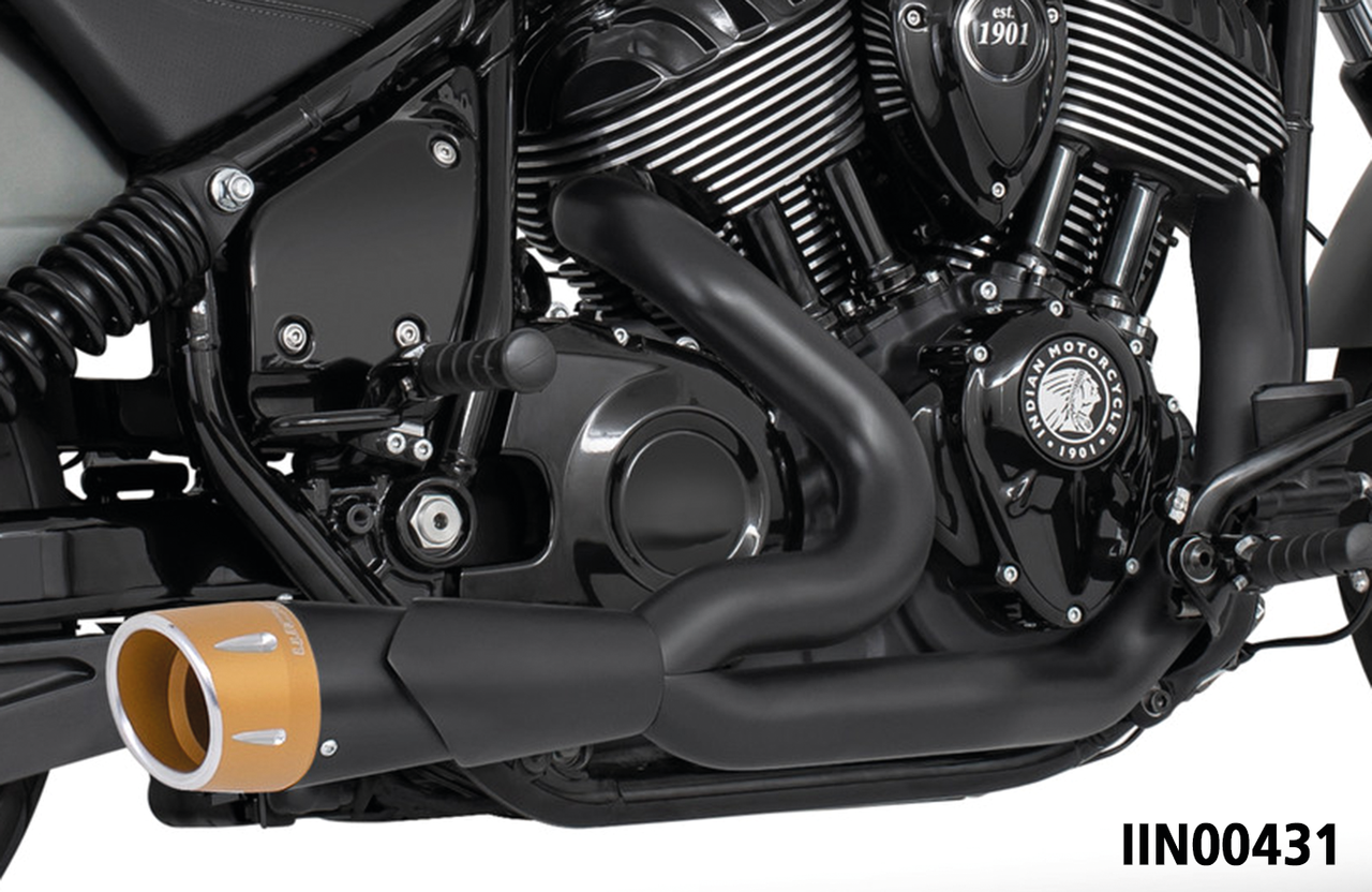 Per Indian Chief Bobber, Chief Classic, Chief Dark Horse, Chief Standard, Chief Vintage e Super Chief dal 2022 a oggi, Combat Shorty 2-in-1 nero con tappo finale Fluted scolpito oro