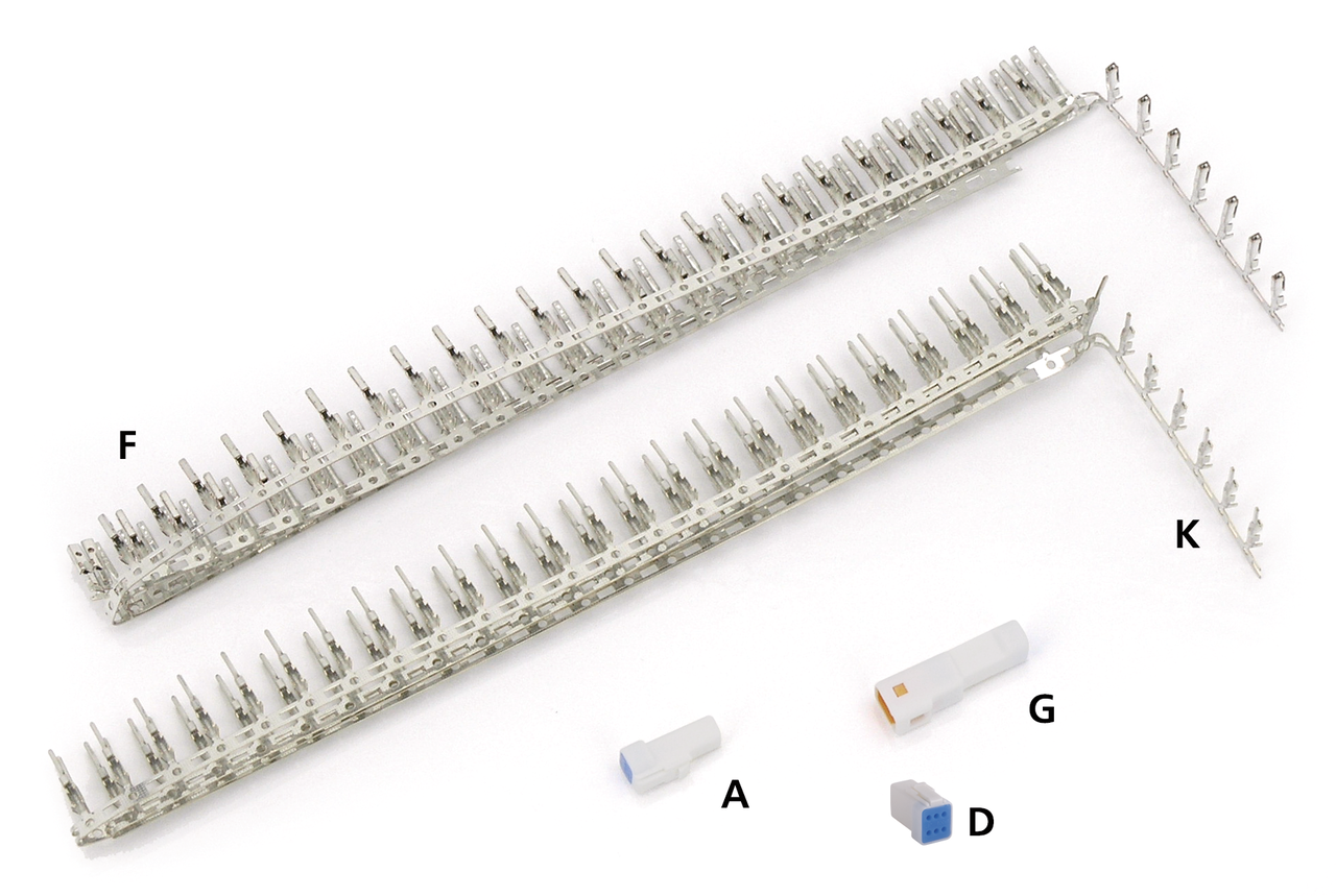 Questi sono i connettori più usati dai customizzatori, piccoli e impermeabili. I connettori sono venduti singolarmente, gli spinotti dei terminali dei connettori maschio e femmina sono venduti in confezione rivenditore da 100 pezzi. Tutti i connettori includono la guarnizione. I connettori JST sono progettati per fili da 22-gauge (0.33mm²) i quali permettono una corrente massima di 5Amp.