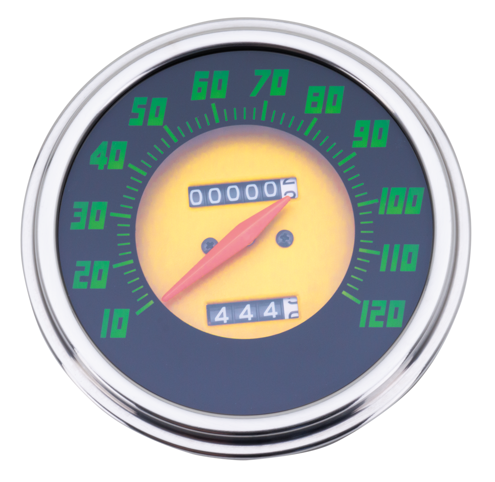 Per Solo 1936-1941 e Servi-Car 45CI e Big Twin 1936-1961, Scala nera con caratteri verdi 10-120, sfondo oro e lancetta rossa