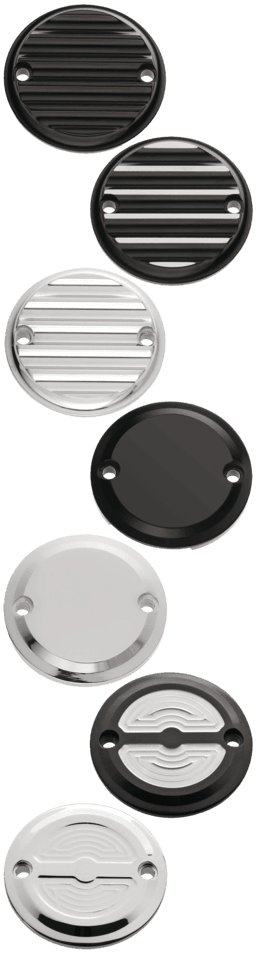 I coperchi anticipo in alluminio billet lavorati a macchina sono spesso chiamati “Points Cover” (coperchi puntine), come ai vecchi tempi quando i motori avevano l’accensione a puntine. Questi coperchi in alluminio billet si adattano alla parte anteriore destra del motore. Prodotti in USA da Joker Machine.