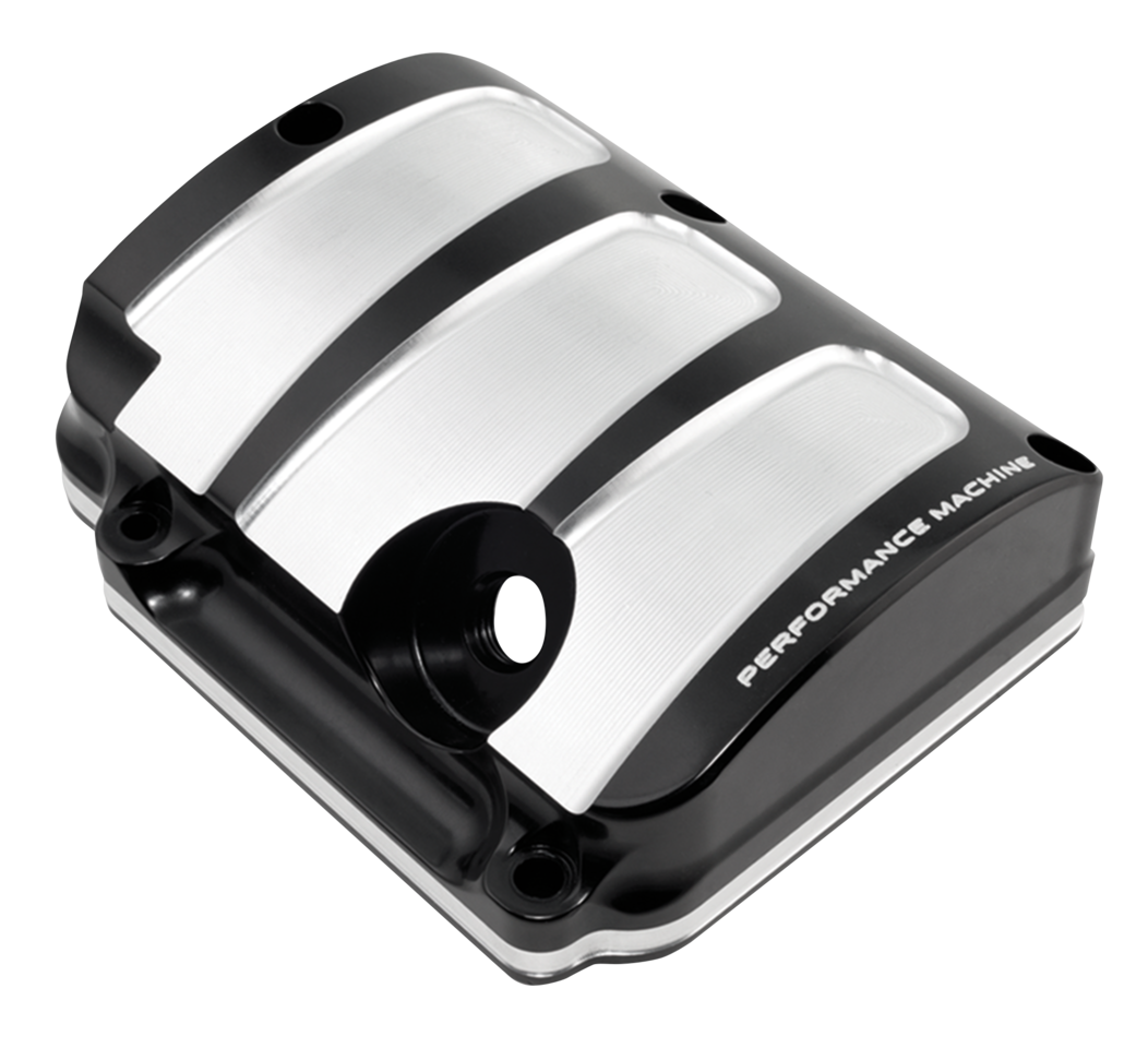 Coperchi della trasmissione superiore in alluminio billet Performance Machine nella tua scelta di cromo, Contrast Cut, Platinum Cut o Black Ops, che si abbina perfettamente al nero rughe su motori e trasmissioni.