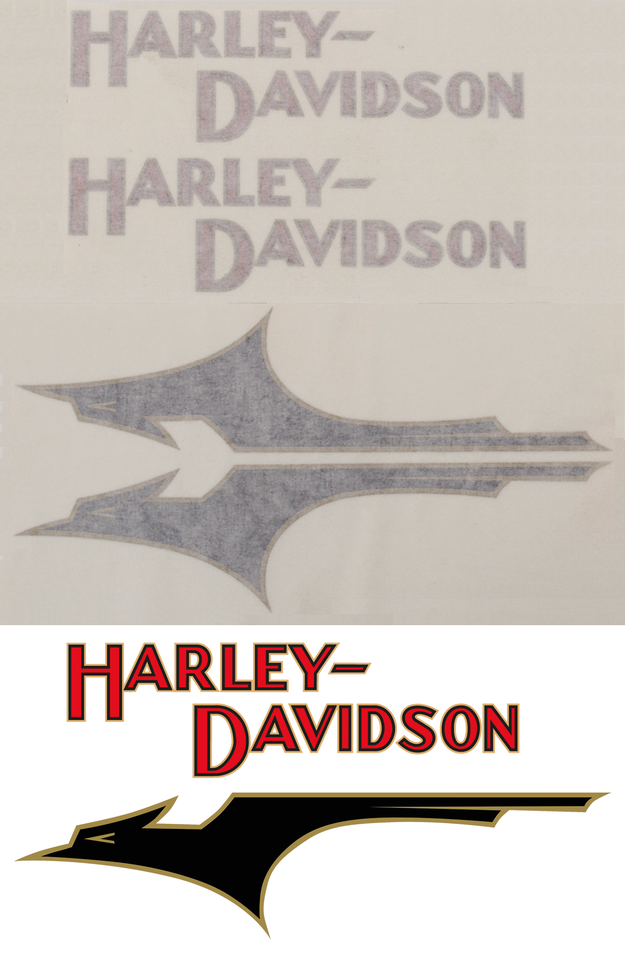 Stile 1933 Teste d’aquila lungh. 19.5cm e alt. 5cm. La scritta “Harley-Davidson” su due line, lungh. 15cm e alt. 4.5cm, Trasferibili ad acqua, con parte centrale nera (OEM 5917-08B & 5923-33)