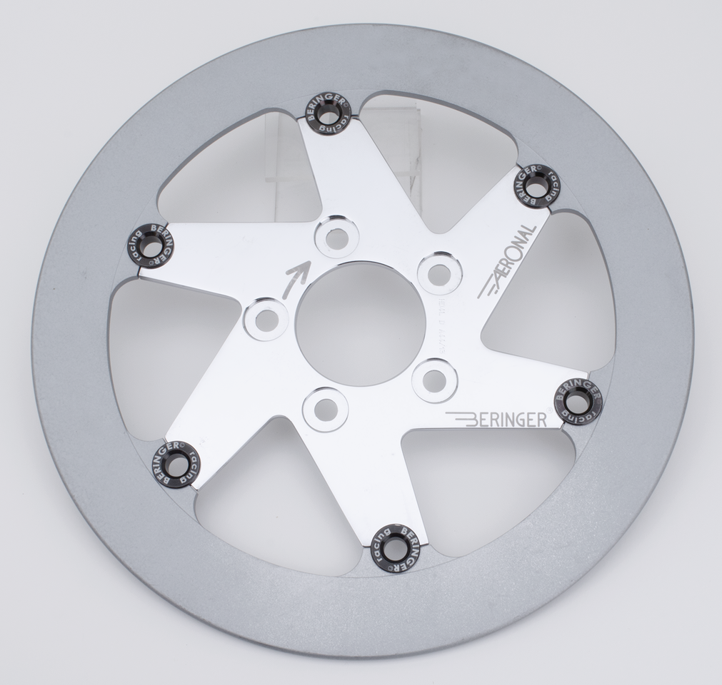 I dischi Beringer usano una fusione di ghisa grigia, materiale universalmente conosciuto per dare le più alte prestazioni sia nell’uso stradale che sportivo. La superficie in ghisa della parte frenante è ricoperta di plasma d’alluminio per prevenire la corrosione e permettere l’uso di pastiglie freno sinterizzate. La potenza frenante aumenta del 40% e l’usura si riduce la minimo. I dischi Beringer’s “Aeronal” sono progettati per applicazioni performanti. Hanno la parte frenante più stretta per ridurre il peso e la parte interna in alluminio aeronautico lavorata a CNC. Le due parti sono unite con 6 nottolini anzichè 12 come nei dischi Classic; questo riduce il peso e l’effetto giroscopico aumentando la manovrabilità della moto. La parte interna è disponibile lucidata, anodizzata nera e cromata. Si raccomanda vivamente l’uso di pastiglie sinterizzate o per prestazioni ancora superiori, pinze freno Beringer. Non compatibili con pinze freno OEM.