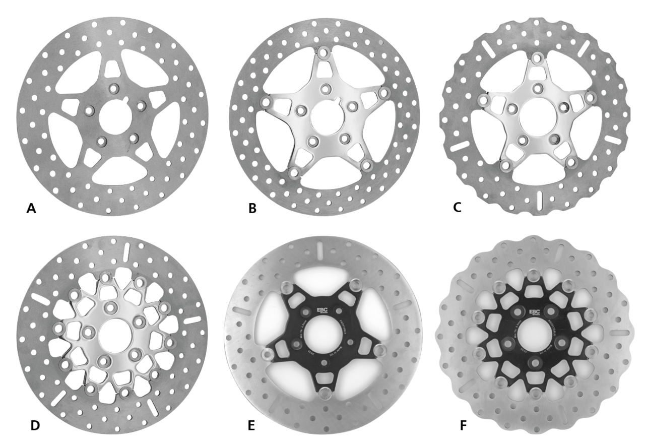 EBC produce una gamma completa di dischi fissi o flottanti per i moderni Big Twin e Sportster. I dischi sono prodotti in UK usando acciaio inox per la pista frenante e acciaio inox lucidato o nero per la parte centrale, dando così una maggiore robustezza. I dischi flottanti sono assemblati usando l’innovativo sistema di nottolini EBC SD System. I dischi flottanti anteriori EBC hanno 5 nottolini di fissaggio mentre i posteriori per una maggiore robustezza ne hanno 10. EBC raccomanda caldamente di sostituire sempre le pastiglie quando sostituite i dischi, perchè delle pastiglie usurate possono causare macchie di calore e strati cristallizati che riducono la frenata. Potete trovare le pastiglie freno EBC in questo catalogo. EBC offre una gamma di dischi fissi o flottanti a 5 razze con profilo tondo o nello stile Contoured. I dischi sono disponibili con banda frenante larga per pinze di serie e banda frenante stretta per pinze freno aftermarket.