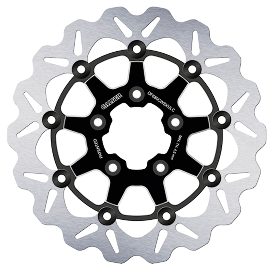 Dischi a 5-fori con montaggio su mozzo, anteriori per molti modelli 2000 in poiDischi hanno un diametro interno di 2 7/32″ e fori di montaggio scalinati 5 x 5/16″ x 3 1/4″, Disco flottante Wave con parte centrale nera lucida
