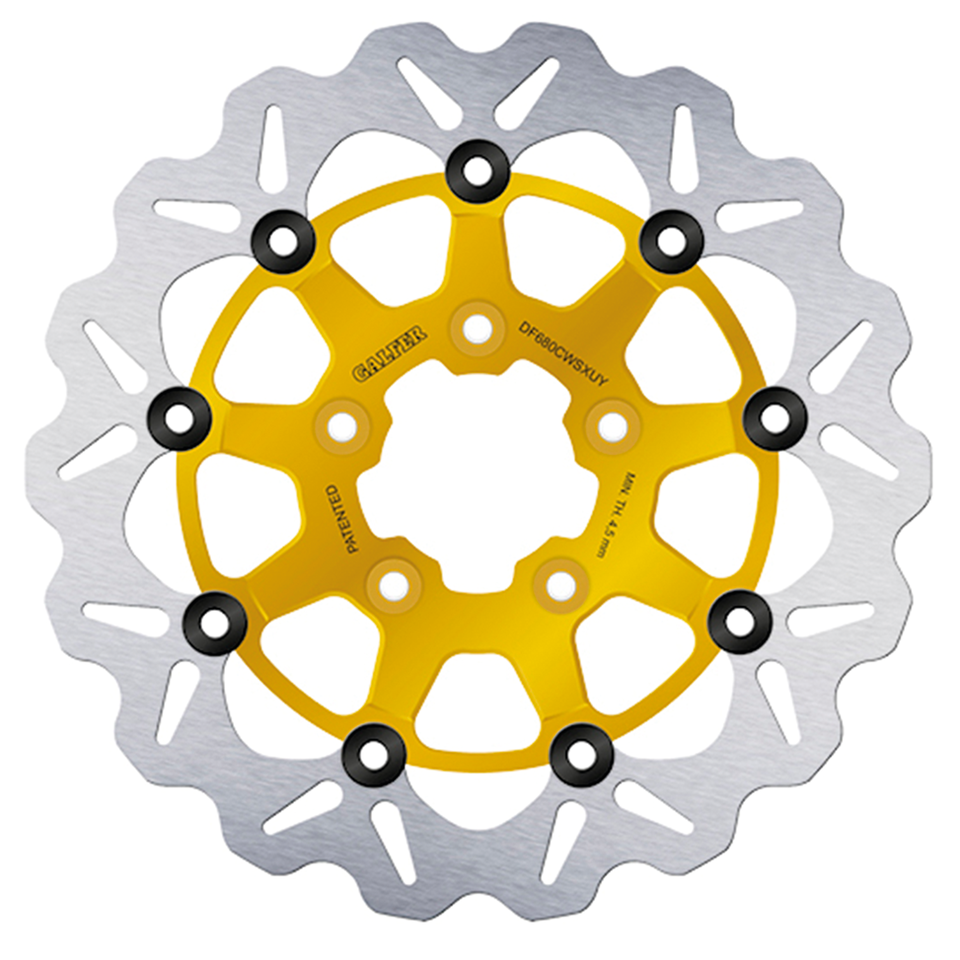 Dischi a 5-fori con montaggio su mozzo, anteriori per molti modelli 2000 in poiDischi hanno un diametro interno di 2 7/32″ e fori di montaggio scalinati 5 x 5/16″ x 3 1/4″, Disco flottante Wave con soparte centrale oro