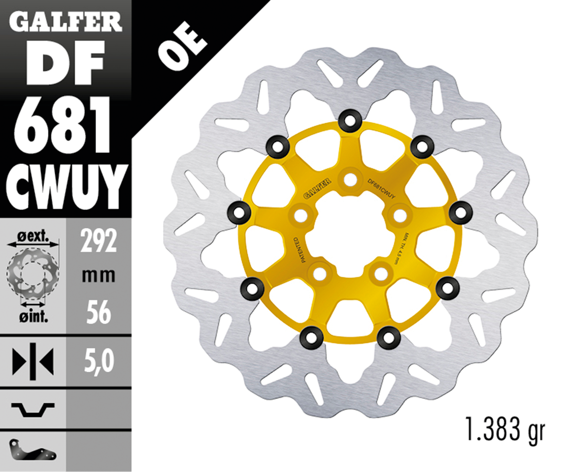 I dischi flottanti Galfer Wave offrono una frenata precisa ed efficiente e un notevole risparmio di peso. Se non diversamente indicato, sono dotati di nottolini in acciaio inox neri che fissano la pista frenante in acciaio inox alla parte centrale in alluminio. Sono utilizzabili con pinze di serie e di ricambio. Sono venduti singolarmente, ordinarne due per applicazioni a doppio disco. Come per ogni disco freno, si raccomanda vivamente di installare nuove pastiglie freno con un nuovo disco freno.