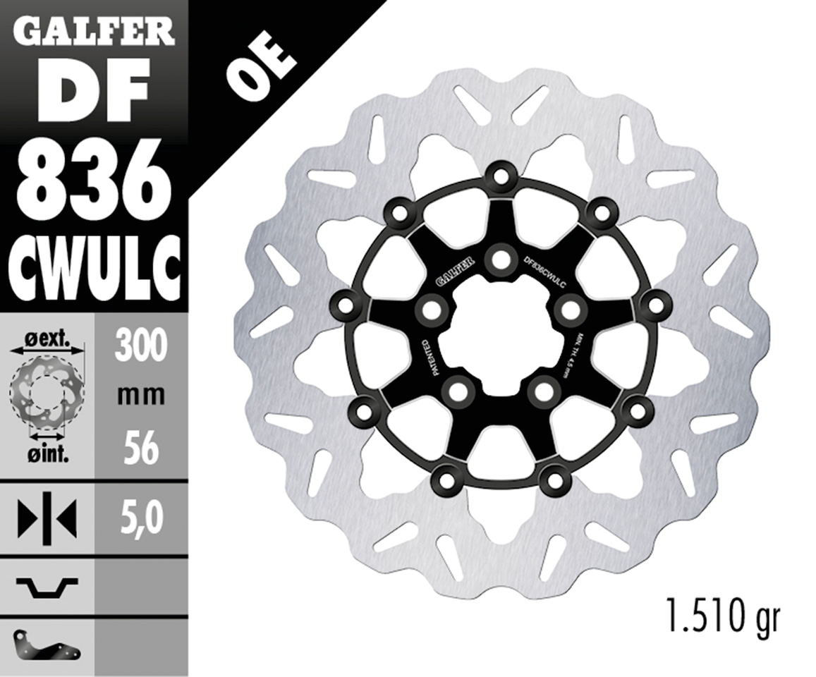 I dischi flottanti Galfer Wave offrono una frenata precisa ed efficiente e un notevole risparmio di peso. Se non diversamente indicato, sono dotati di nottolini in acciaio inox neri che fissano la pista frenante in acciaio inox alla parte centrale in alluminio. Sono utilizzabili con pinze di serie e di ricambio. Sono venduti singolarmente, ordinarne due per applicazioni a doppio disco. Come per ogni disco freno, si raccomanda vivamente di installare nuove pastiglie freno con un nuovo disco freno.